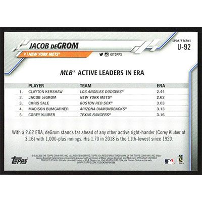 This is a 2020 Topps Update Jacob deGrom MLB Leaders baseball card. The card is #U-92 and pictures show condition.