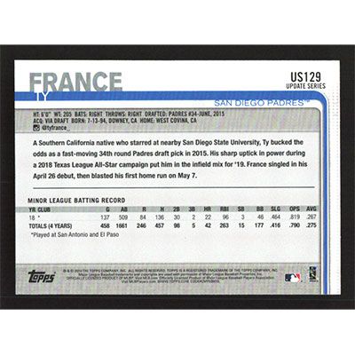 This is a 2020 Topps Update Ty France baseball card. The card is #US129 and pictures show condition.
