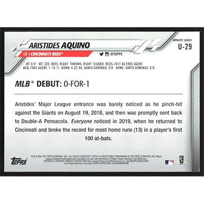 This is a 2020 Topps Update Wal-Mart Royal Blue Aristides Aquino Rookie Debut baseball card. The card is #U-29 and pictures show condition. Team(s): Cincinnati Reds Rookie Card (RC)