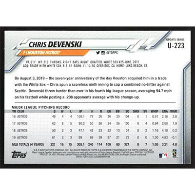 This is a 2020 Topps Update Walgreens Yellow Chris Devenski baseball card. The card is #U-223 and pictures show condition.