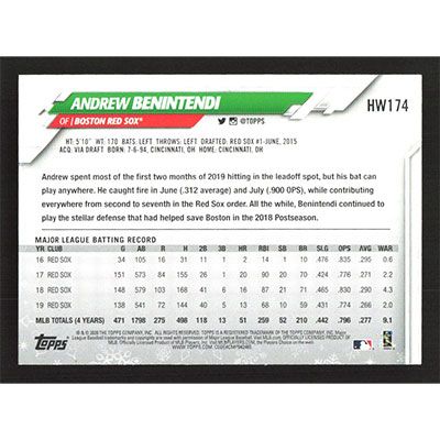 This is a 2020 Topps Wal-Mart Holiday Andrew Benintendi baseball card. The card is #HW174 and pictures show condition.