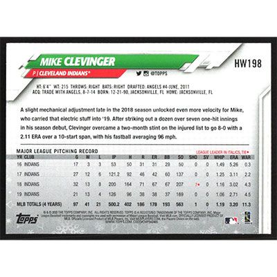 This is a 2020 Topps Wal-Mart Holiday Mike Clevinger baseball card. The card is #HW198 and pictures show condition.