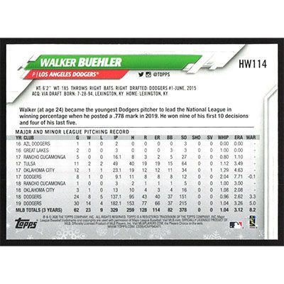 This is a 2020 Topps Wal-Mart Holiday Photo Variations Walker Buehler Santa Hat baseball card. The card is #HW114 and pictures show condition. Team(s): Los Angeles Dodgers