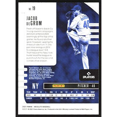 This is a 2021 Absolute Jacob deGrom baseball card. The card is #19 and pictures show condition.
