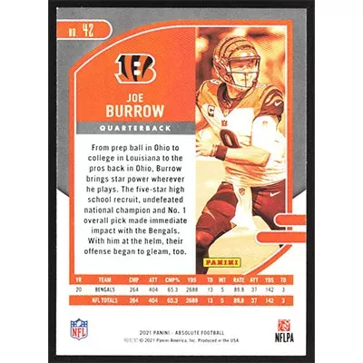 This is a 2021 Absolute Joe Burrow football card. The card is #42 and pictures show condition.