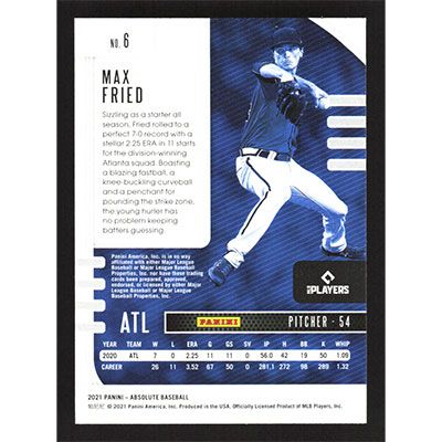 This is a 2021 Absolute Max Fried baseball card. The card is #6 and pictures show condition.