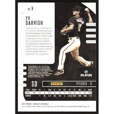 This is a 2021 Absolute Yu Darvish baseball card. The card is #9 and pictures show condition.