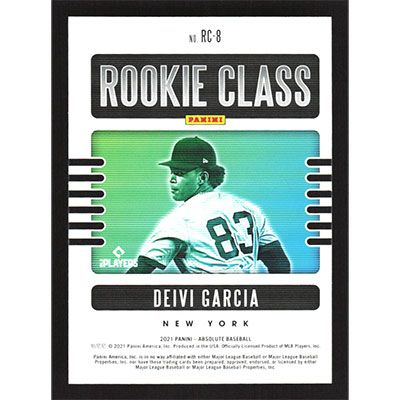 This is a 2021 Absolute Rookie Class Deivi Garcia baseball card. The card is #RC-8 and pictures show condition.