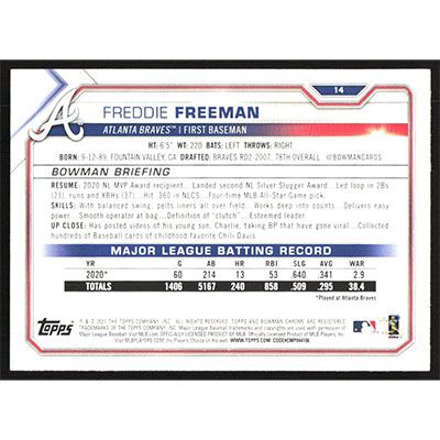 This is a 2021 Bowman Freddie Freeman baseball card. The card is #14 and pictures show condition.
