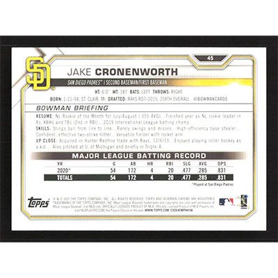 This is a 2021 Bowman Jake Cronenworth baseball card. The card is #45 and pictures show condition.