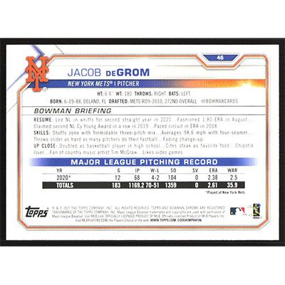 This is a 2021 Bowman Jacob deGrom baseball card. The card is #46 and pictures show condition.