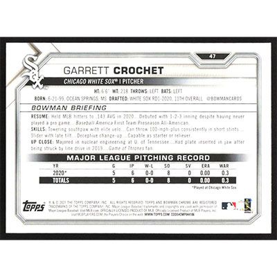 This is a 2021 Bowman Garrett Crochet baseball card. The card is #47 and pictures show condition.