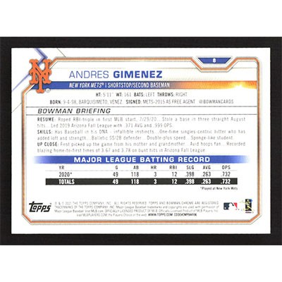 This is a 2021 Bowman Andres Gimenez baseball card. The card is #8 and pictures show condition.