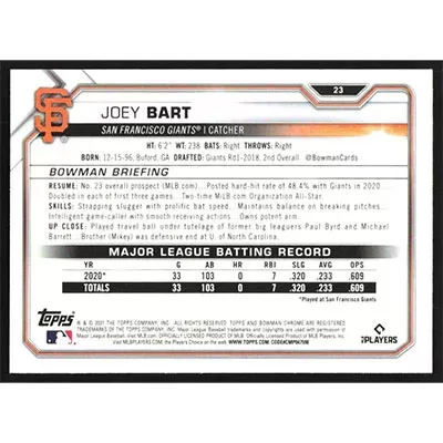 This is a 2021 Bowman Chrome Joey Bart baseball card. The card is #23 and pictures show condition.