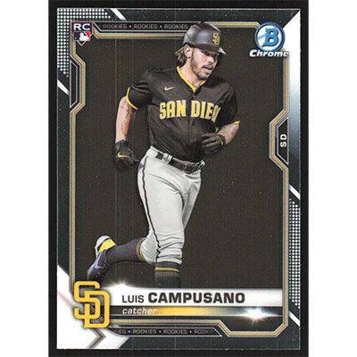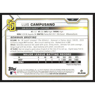 This is a 2021 Bowman Chrome Luis Campusano baseball card. The card is #37 and pictures show condition.