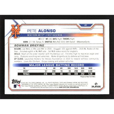 This is a 2021 Bowman Chrome Pete Alonso baseball card. The card is #41 and pictures show condition.