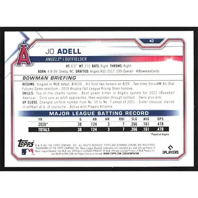 This is a 2021 Bowman Chrome Jo Adell baseball card. The card is #42 and pictures show condition.
