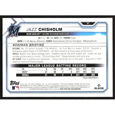 This is a 2021 Bowman Chrome Jazz Chisholm baseball card. The card is #57 and pictures show condition.
