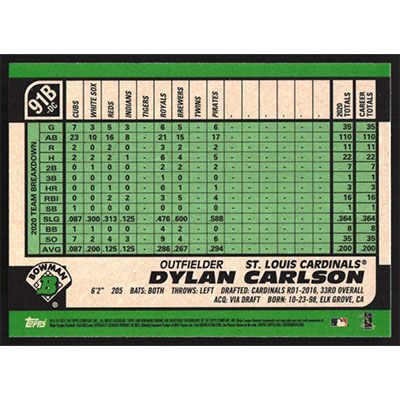 This is a 2021 Bowman Chrome '91 Refractors Dylan Carlson baseball card. The card is #91B-DC and pictures show condition. Team(s): St. Louis Cardinals Rookie Card (RC)