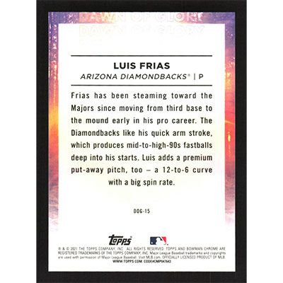 This is a 2021 Bowman Chrome Dawn of Glory Refractors Luis Frias baseball card. The card is #DOG-15 and pictures show condition. Team(s): Arizona Diamondbacks