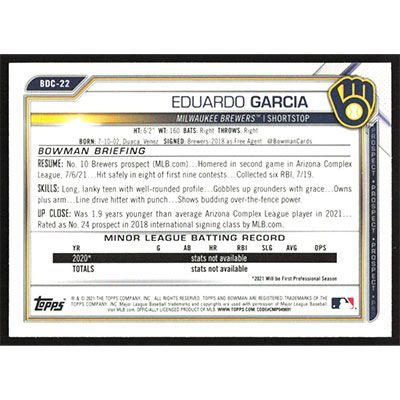 This is a 2021 Bowman Chrome Draft Sapphire Eduardo Garcia baseball card. The card is #BDC-22 and pictures show condition.