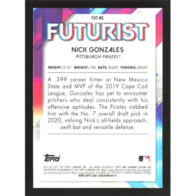 This is a 2021 Bowman Chrome Futurist Refractors Nick Gonzales baseball card. The card is #FUT-NG and pictures show condition. Team(s): Pittsburgh Pirates