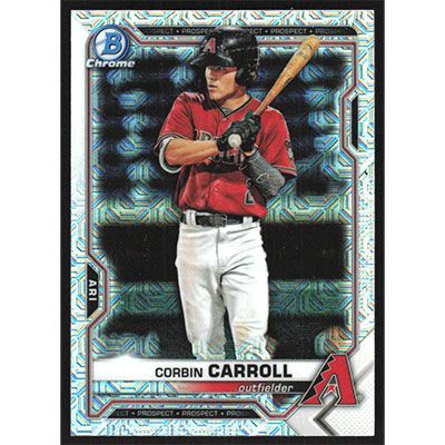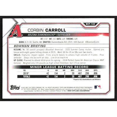 This is a 2021 Bowman Chrome Mega Box Prospects Refractors Corbin Carroll baseball card. The card is #BCP-142 and pictures show condition. Team(s): Arizona Diamondbacks