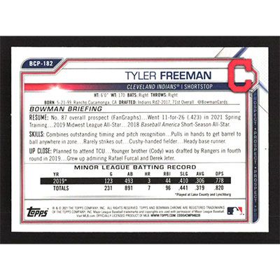 This is a 2021 Bowman Chrome Mega Box Prospects Refractors Tyler Freeman baseball card. The card is #BCP-182 and pictures show condition. Team(s): Cleveland Indians