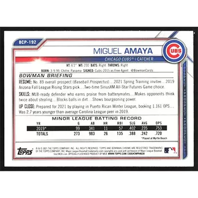 This is a 2021 Bowman Chrome Mega Box Prospects Refractors Miguel Amaya baseball card. The card is #BCP-192 and pictures show condition. Team(s): Chicago Cubs