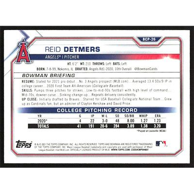 This is a 2021 Bowman Chrome Mega Box Prospects Refractors Reid Detmers baseball card. The card is #BCP-26 and pictures show condition. Team(s): Los Angeles Angels