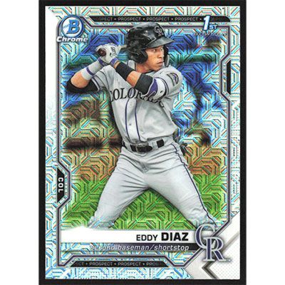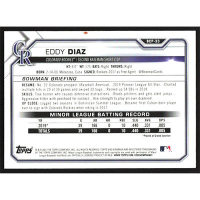 This is a 2021 Bowman Chrome Mega Box Prospects Refractors Eddy Diaz baseball card. The card is #BCP-33 and pictures show condition. Team(s): Colorado Rockies