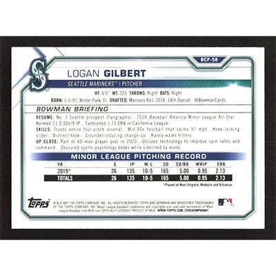 This is a 2021 Bowman Chrome Mega Box Prospects Refractors Logan Gilbert baseball card. The card is #BCP-58 and pictures show condition.