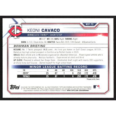 This is a 2021 Bowman Chrome Mega Box Prospects Refractors Keoni Cavaco baseball card. The card is #BCP-73 and pictures show condition. Team(s): Minnesota Twins