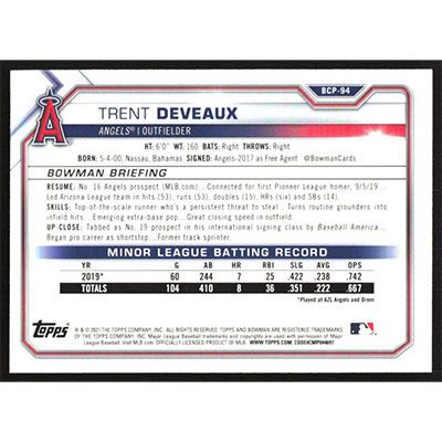 This is a 2021 Bowman Chrome Mega Box Prospects Refractors Trent Deveaux baseball card. The card is #BCP-94 and pictures show condition. Team(s): Los Angeles Angels