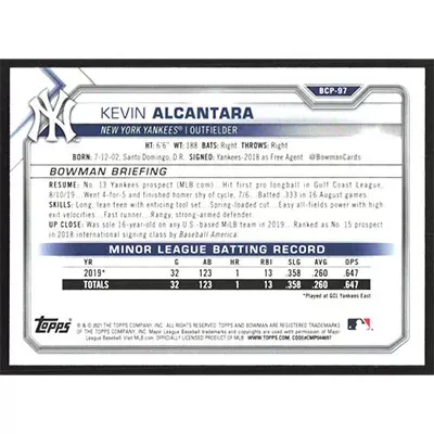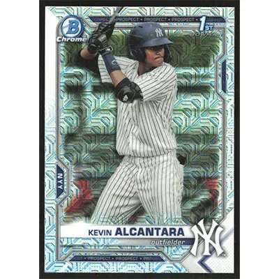 This is a 2021 Bowman Chrome Mega Box Prospects Refractors Kevin Alcantara baseball card. The card is #BCP-97 and pictures show condition. Team(s): New York Yankees