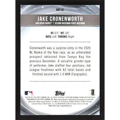 This is a 2021 Bowman Chrome Mega Box Rookie of the Year Favorites Refractors Jake Cronenworth baseball card. The card is #RRY-JC and pictures show condition.