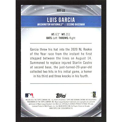 This is a 2021 Bowman Chrome Mega Box Rookie of the Year Favorites Refractors Luis Garcia baseball card. The card is #RRY-LG and pictures show condition.