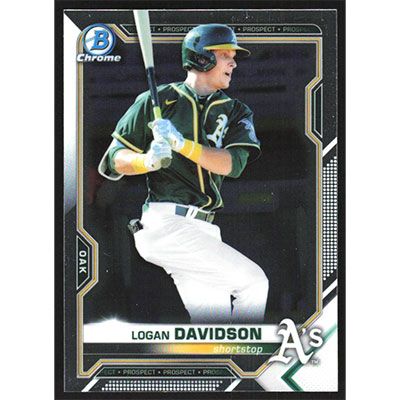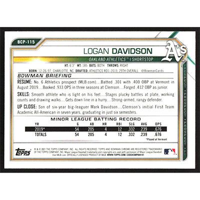 This is a 2021 Bowman Chrome Prospects Logan Davidson baseball card. The card is #BCP-115 and pictures show condition.