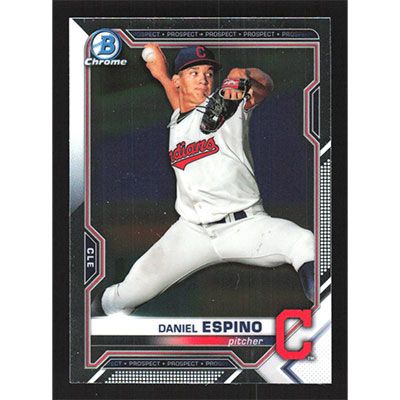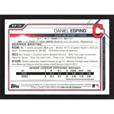 This is a 2021 Bowman Chrome Prospects Daniel Espino baseball card. The card is #BCP-123 and pictures show condition.