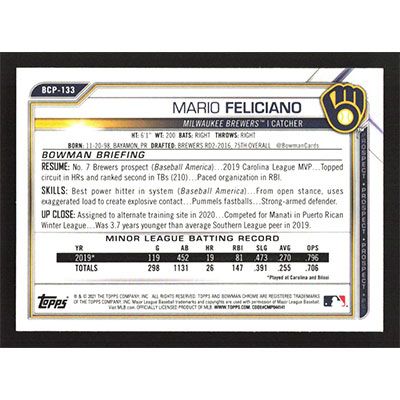 This is a 2021 Bowman Chrome Prospects Mario Feliciano baseball card. The card is #BCP-133 and pictures show condition.