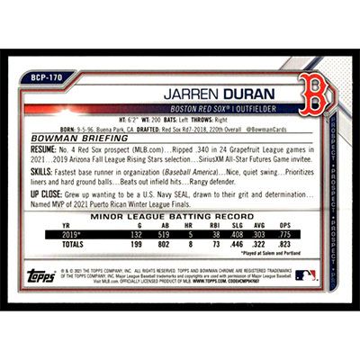 This is a 2021 Bowman Chrome Prospects Jarren Duran baseball card. The card is #BCP-170 and pictures show condition.