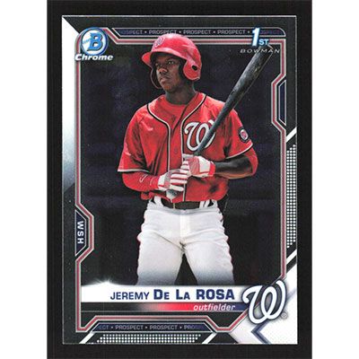 This is a 2021 Bowman Chrome Prospects Jeremy De La Rosa baseball card. The card is #BCP-25 and pictures show condition.