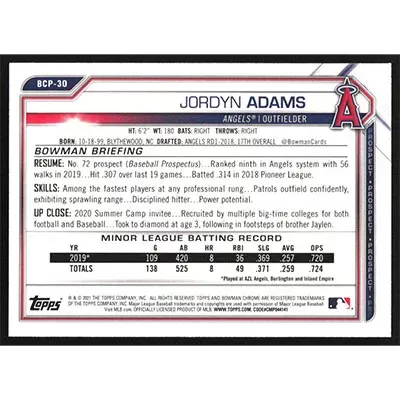 This is a 2021 Bowman Chrome Prospects Jordyn Adams baseball card. The card is #BCP-30 and pictures show condition.