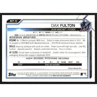 This is a 2021 Bowman Chrome Prospects Dax Fulton baseball card. The card is #BCP-32 and pictures show condition.