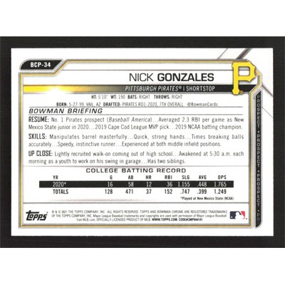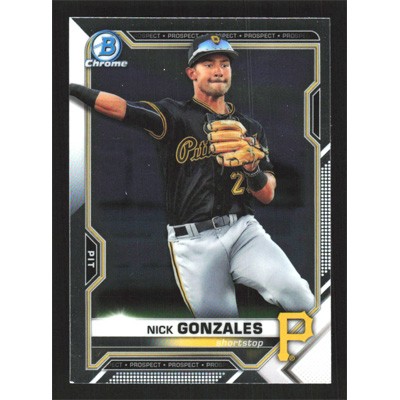 This is a 2021 Bowman Chrome Prospects Nick Gonzales baseball card. The card is #BCP-34 and pictures show condition.