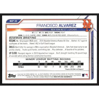 This is a 2021 Bowman Chrome Prospects Francisco Alvarez baseball card. The card is #BCP-53 and pictures show condition.