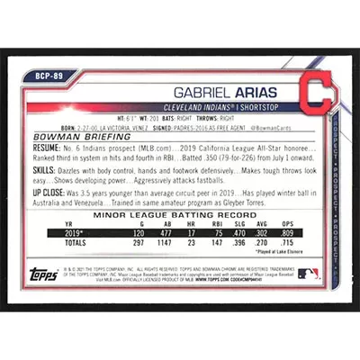 This is a 2021 Bowman Chrome Prospects Gabriel Arias baseball card. The card is #BCP-89 and pictures show condition.