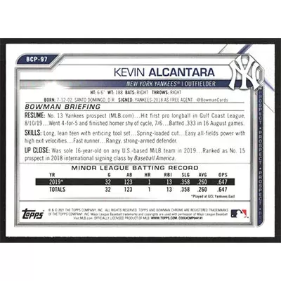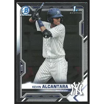 This is a 2021 Bowman Chrome Prospects Kevin Alcantara baseball card. The card is #BCP-97 and pictures show condition.