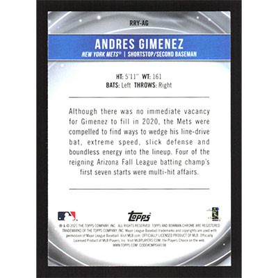 This is a 2021 Bowman Chrome Rookie of the Year Favorites Refractors Andres Gimenez baseball card. The card is #RRY-AG and pictures show condition. Team(s): New York Mets Rookie Card (RC)