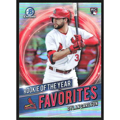 This is a 2021 Bowman Chrome Rookie of the Year Favorites Refractors Dylan Carlson baseball card. The card is #RRY-DC and pictures show condition. Team(s): St. Louis Cardinals Rookie Card (RC)